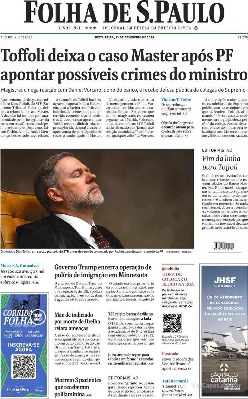 Folha cobra, em editorial, que Toffoli se licencie do STF