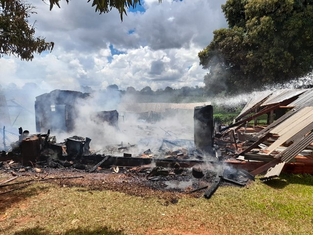 Uma casa de madeira foi completamente destruída por um incêndio em Indianópolis, no noroeste do Paraná, no domingo (3).
