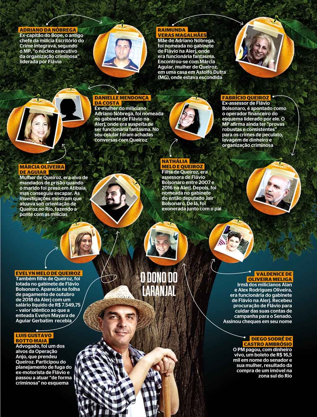 Jair Bolsonaro sustenta que não tem ligação com o escândalo do filho. Mas suas digitais estão por toda parte. Pouco antes de assumir, tentou explicar o repasse de R$ 24 mil de Queiroz para a conta da primeira-dama Michelle Bolsonaro. Disse que o valor se referia ao pagamento de empréstimo não declarado de R$ 40 mil. Entre os supostos funcionários fantasma do gabinete do filho, dez eram da família Siqueira, de Resende, no Rio. Todos são parentes de Ana Cristina Siqueira Valle, ex-mulher do presidente. A ligação com Queiroz é notória. O mandatário já admitiu que a condecoração a Adriano da Nóbrega na Alerj ocorreu a seu pedido. Naquela época “Adriano era um herói”, disse. Mas o presidente nega ter ligação com milicianos.