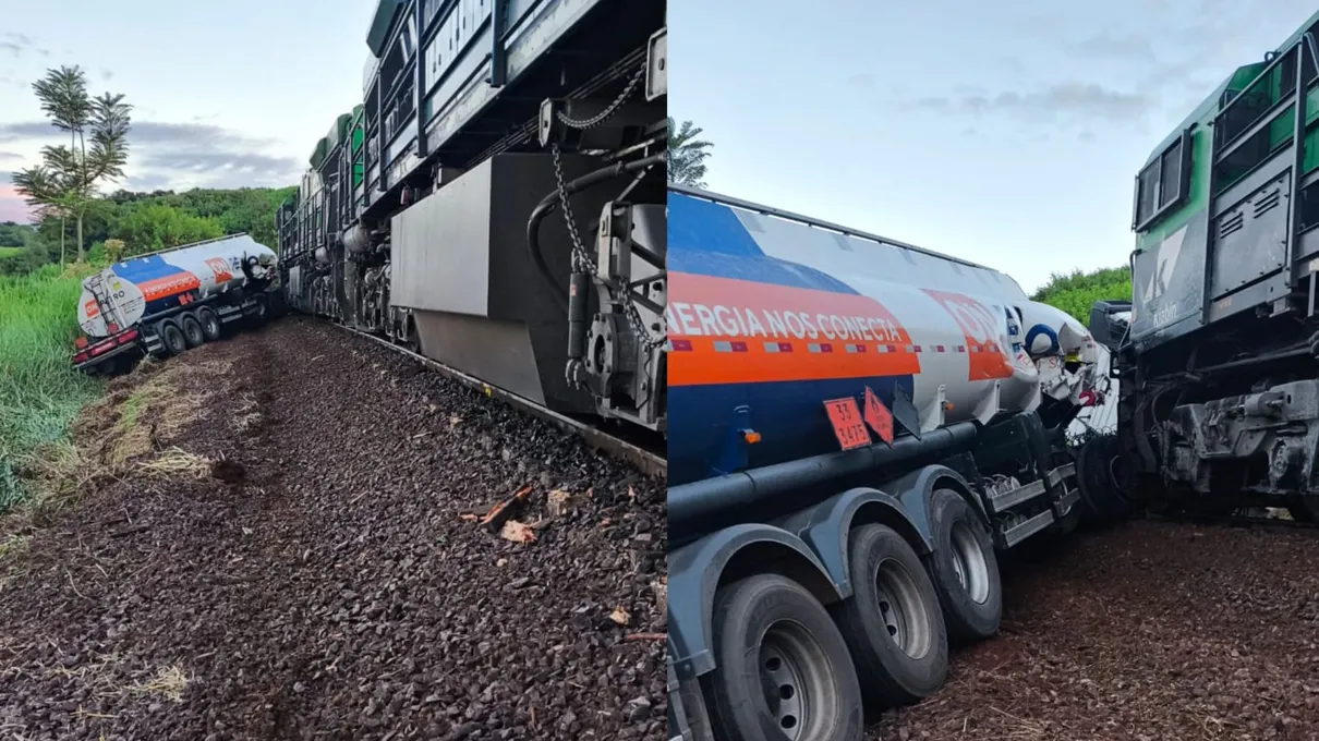 Caminhão-tanque colide com trem e é arrastado por cerca de 100 metros