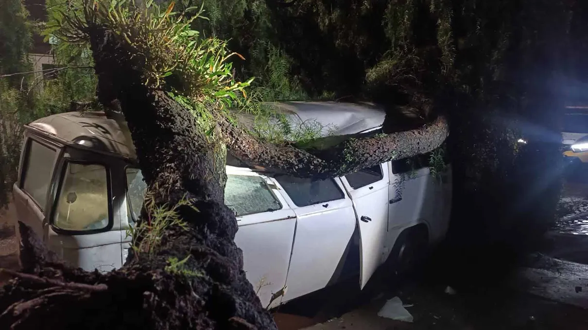 Segundo o Corpo de Bombeiros, foram cinco chamados entre 18h45 e 22h30. Um deles envolveu uma Kombi atingida por uma árvore na Rua Rio Grande do Norte.