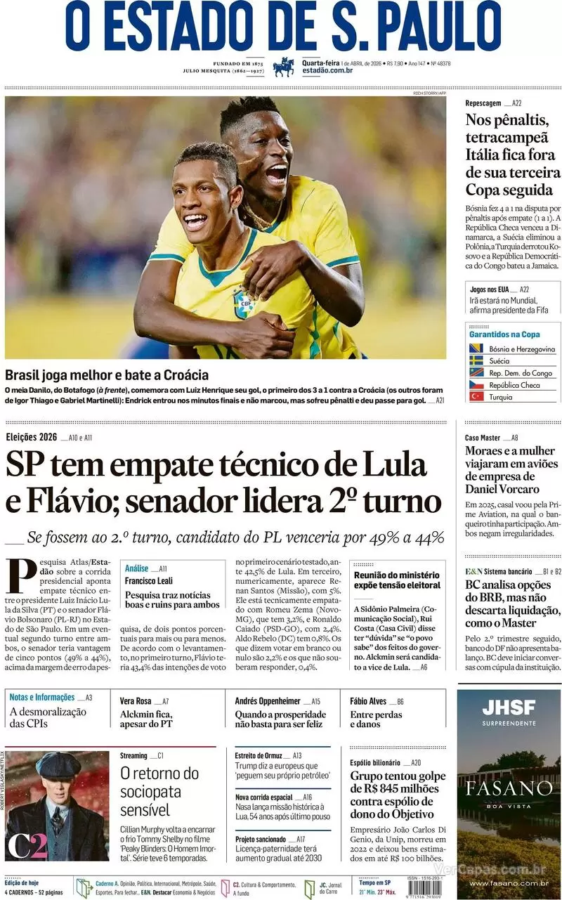 A Pesquisa do Jornal O Estadão confirmada e mostrando um cenário de empate técnico entre Presidente Lula e Flávio Bolsonaro no estado de São Paulo e com a informação do Jornal o tempo que Presidente Lula lidera em Minas Gerais mostrando liderança do Presidente Lula, com isso; fatalmente Presidente Lula poderá vencer as eleições Presidenciais em 2026.